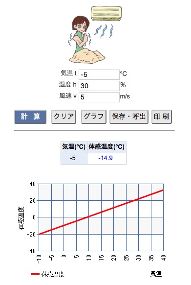 気温-5℃、湿度30%、風速5mの場合