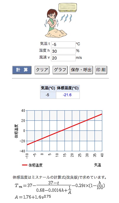 気温-5℃、湿度30%、風速20mの場合
