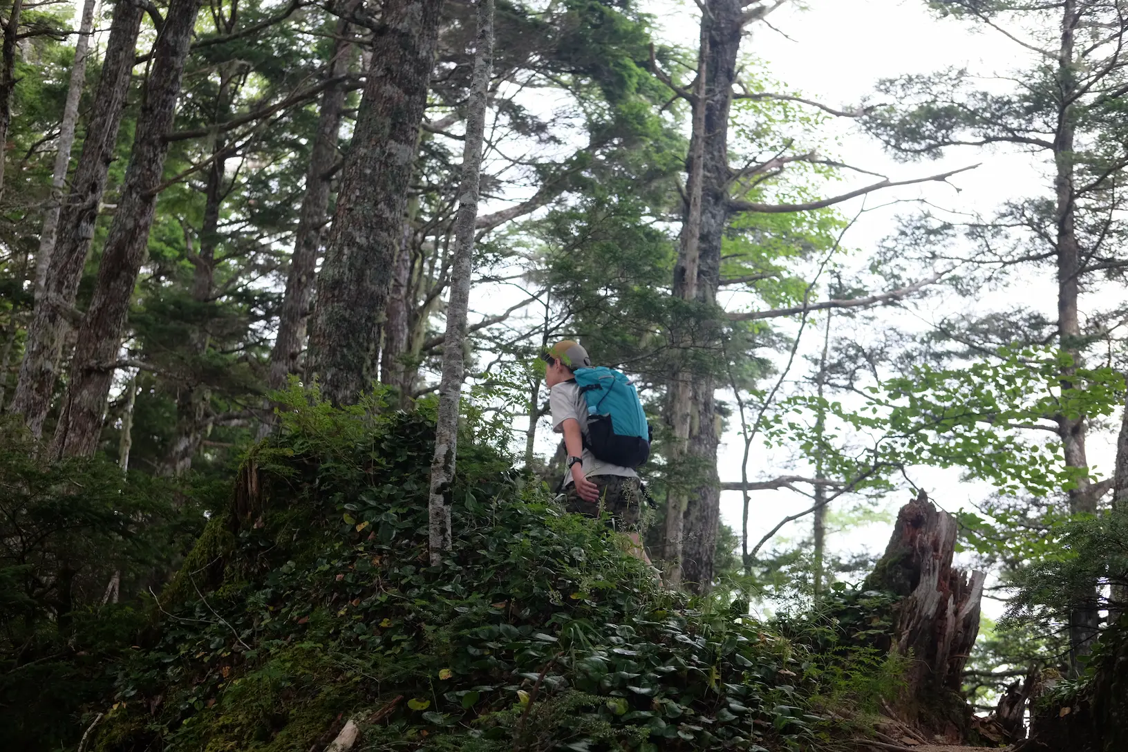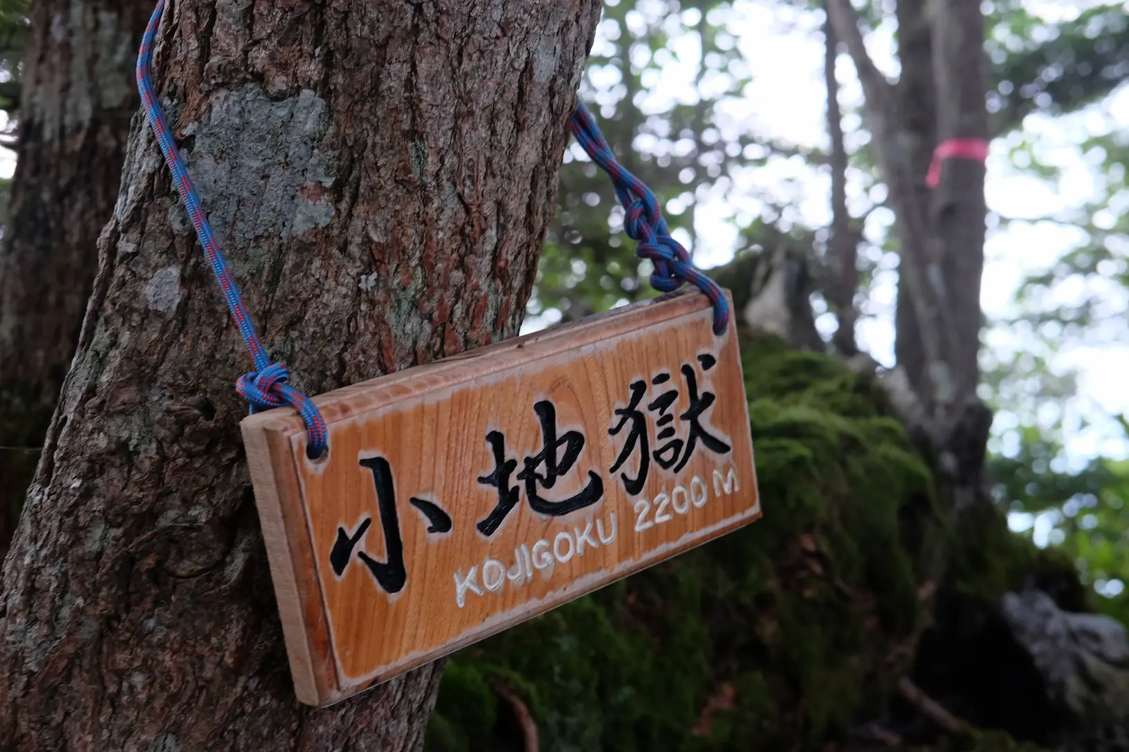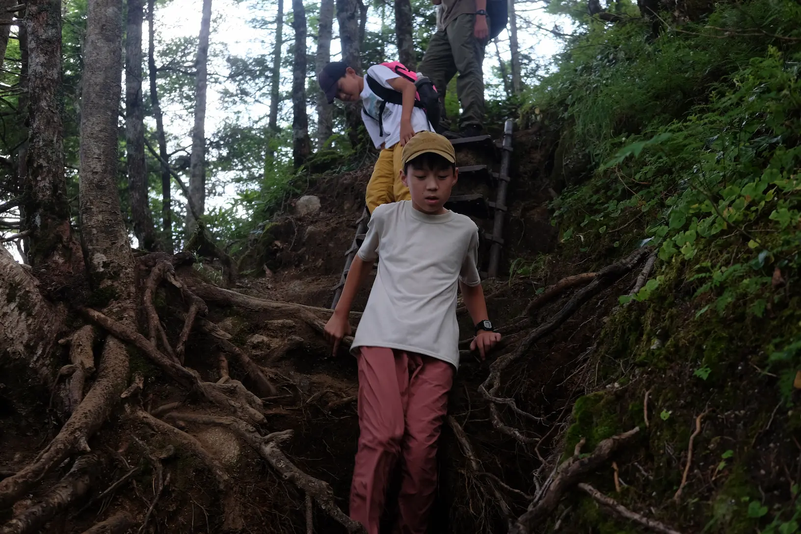 森林限界に出るまでの注意箇所は、間違いなく小地獄・大地獄。この区間は特に注意が必要。急峻なヤセ尾根なので、特に子連れは慎重に歩きたいところ。僕らも時間をかけてゆっくりと通過した。