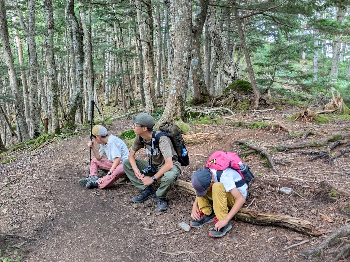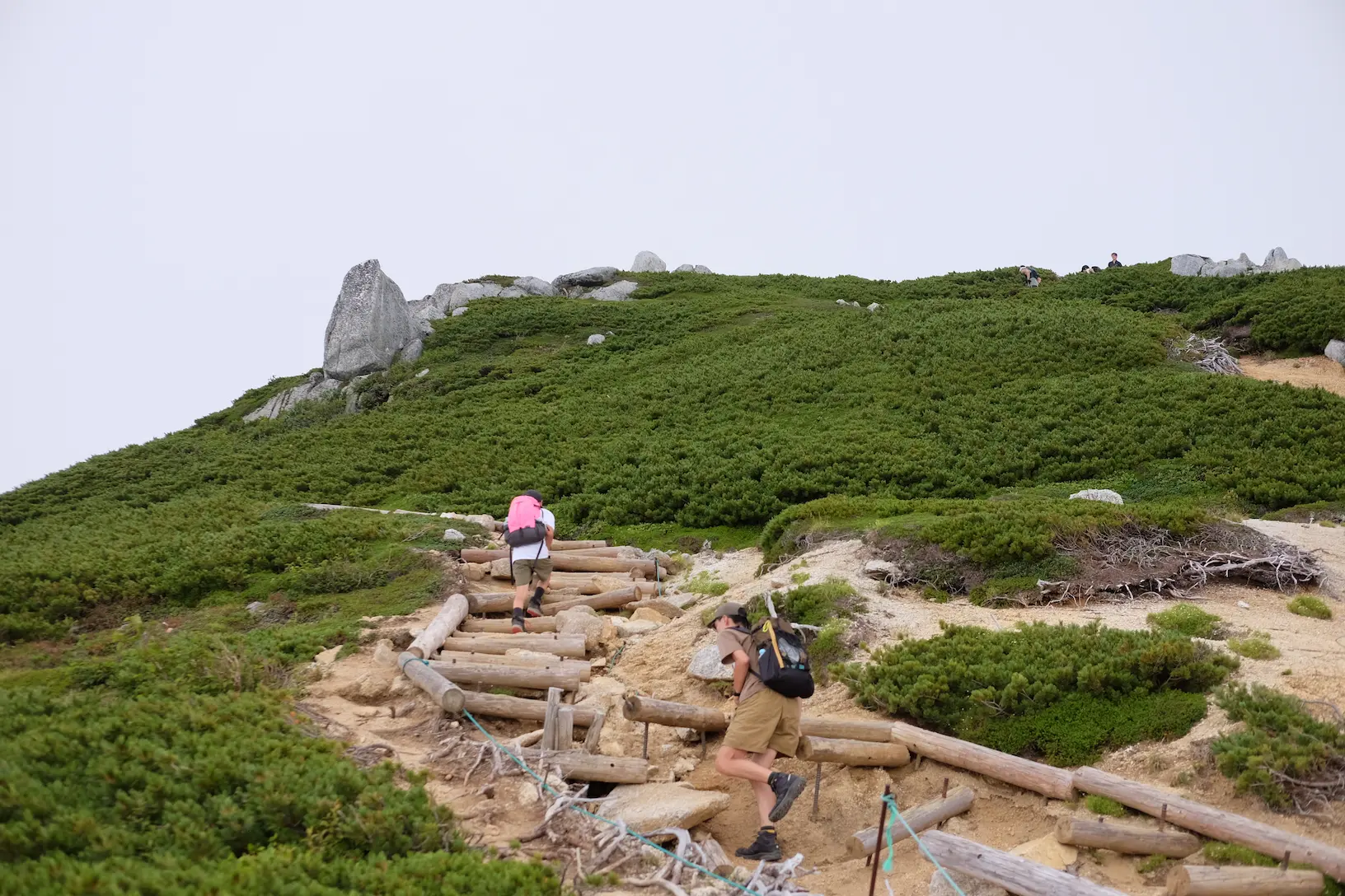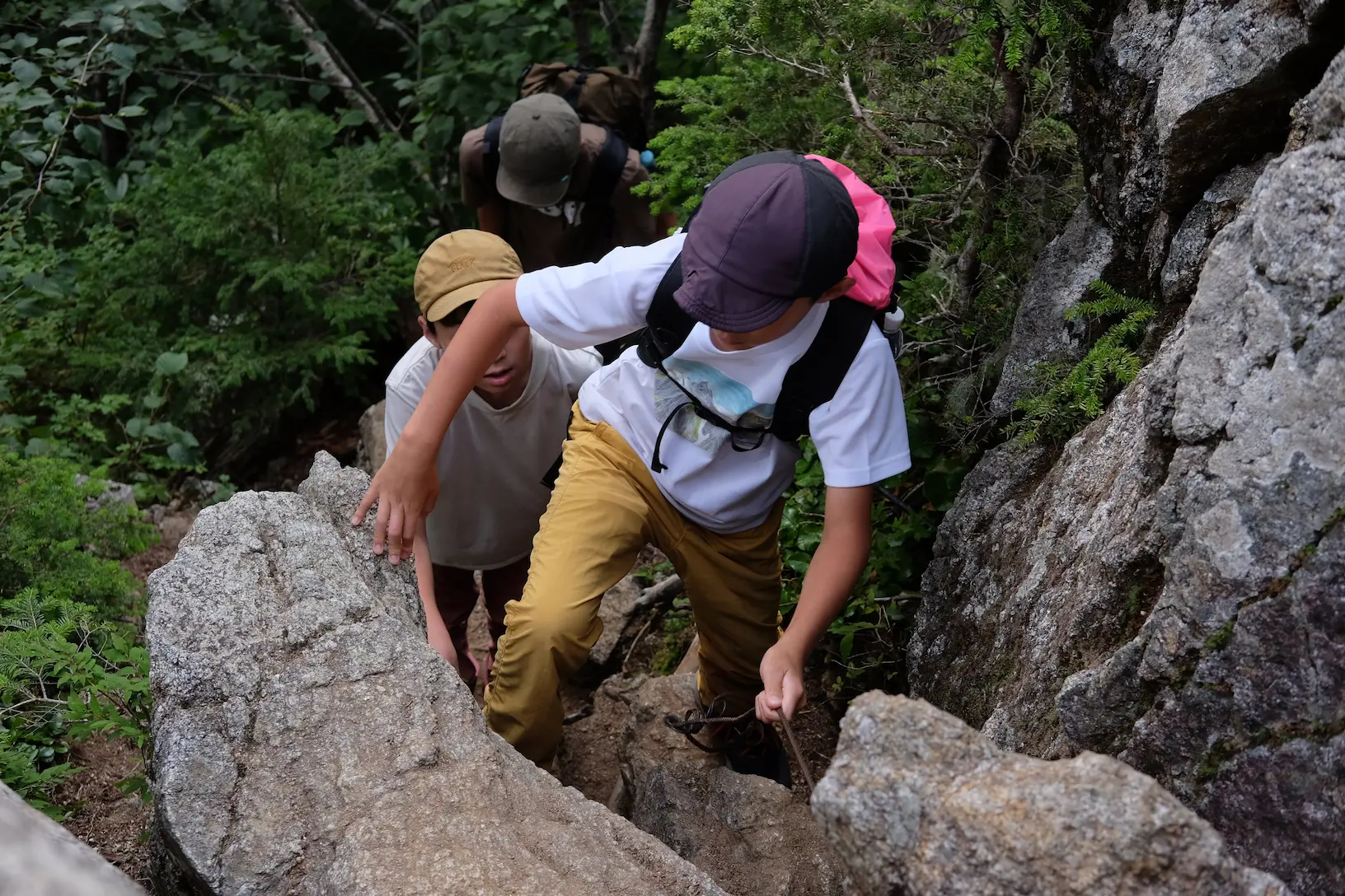 森林限界に出るまでの注意箇所は、間違いなく小地獄・大地獄。この区間は特に注意が必要。急峻なヤセ尾根なので、特に子連れは慎重に歩きたいところ。僕らも時間をかけてゆっくりと通過した。