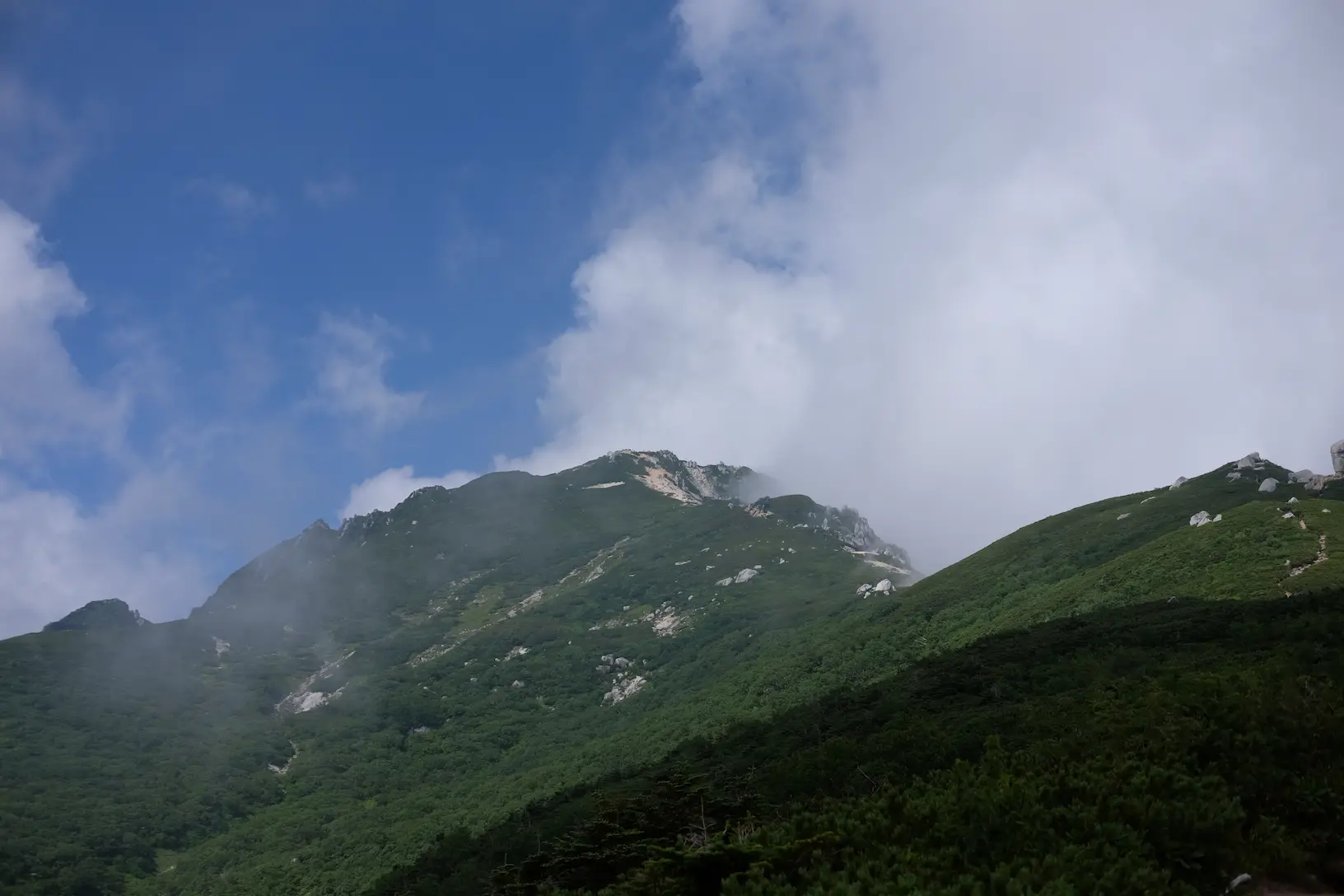 池山小屋から黙々と歩き続け、大地獄・小地獄の写真は1枚もなし。2枚目に撮った写真がココだから、かなり集中して歩いてたと思う。この景色は、初回(2019年)山行でも辿り着けなかったから、やっと空木岳本体をこの目で見ることができた。