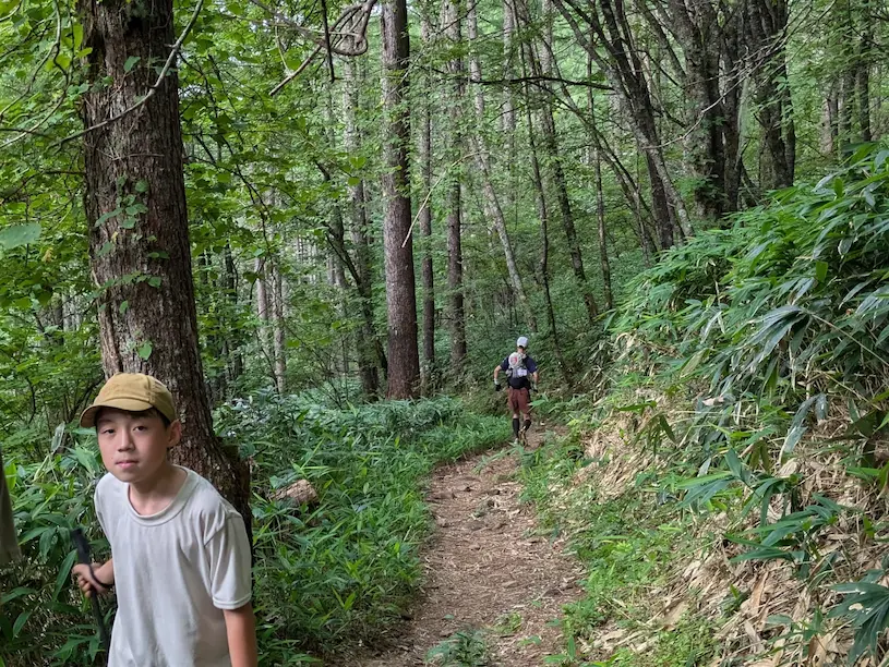 池山避難小屋を過ぎた頃には全員脚が痛くて、でも進まなきゃ帰れない。そんな時、TJAR選手が2名追い抜いて行った(No6.牧野選手とNo4.保田選手)。往復25kmちょっとの池山尾根日帰りピストンの僕らより、富山県の海から山を越えて歩いてきた選手(この時点でも数百km)の方が元気という…、やっぱり只者じゃない。僕らも気力を振り絞って最後まで頑張ろう。